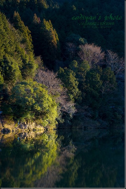 日が傾いて山と山の間から差し込む光が、川岸を照らしている風景です。